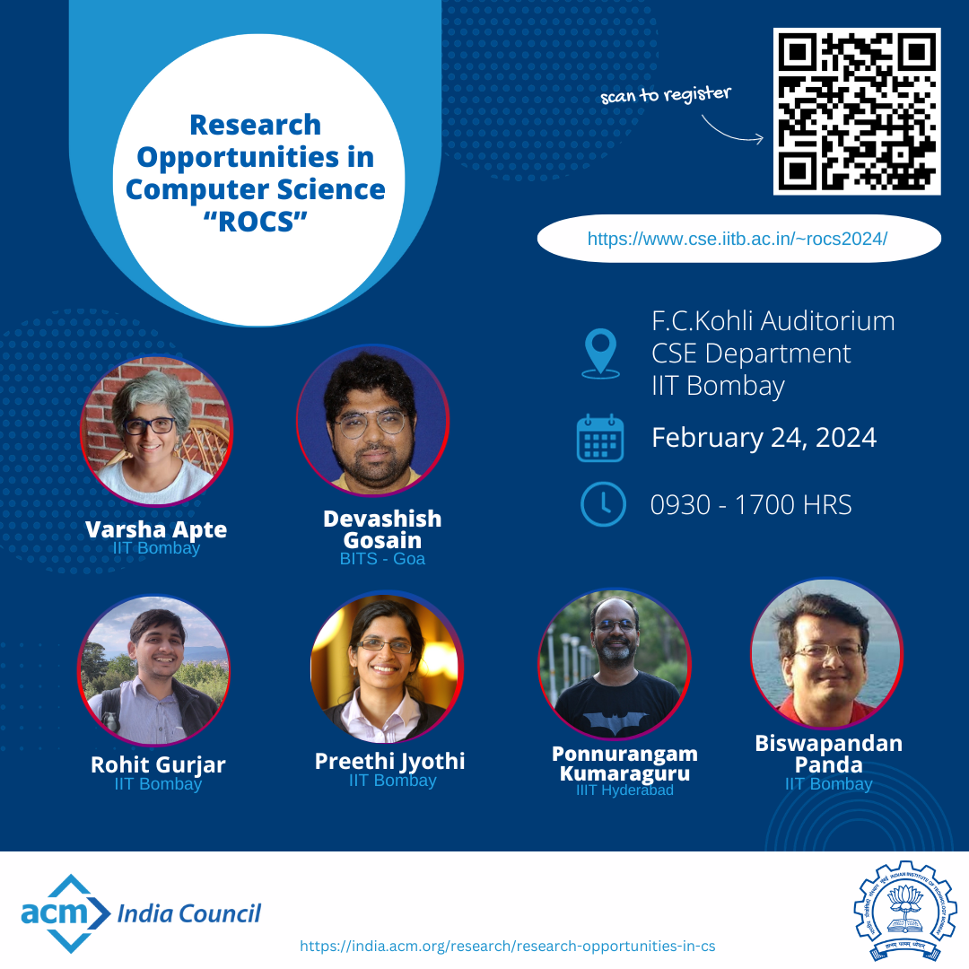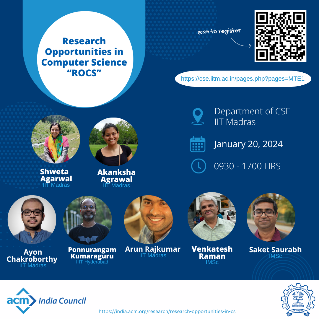 Research Opportunities in Computer Science: Register for #ROCSatIITM here & #ROCSatIITB here. ROCS (pronounced as ROCKS) is an initiative to expose undergraduate students in (mainly aspiring) colleges / universities / institutes to exciting research happening in the country in various areas of computer science. The hope is to inspire at least a few of them to choose a career in research in industry or academics. More details about ROCS here . If you / your institute is interested in hosting ROCS, please see here.
