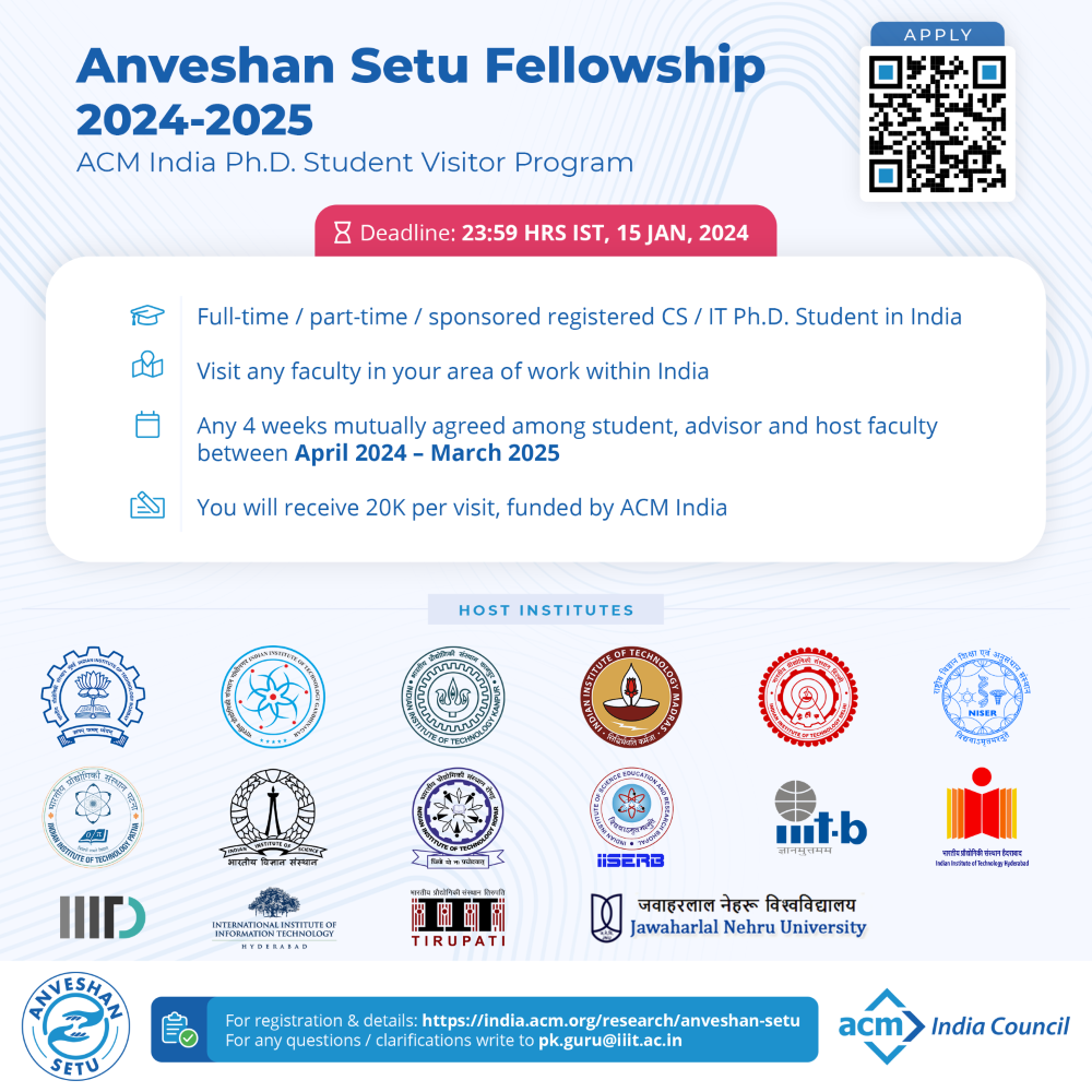 Reminder - ACM India Anveshan Setu 2024 Fellowships. PhD Student Visitor Program: Apply by 15 Jan. 2024