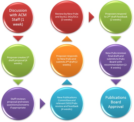 ACM staff is available to advise and assist in the development of your proposal. The first step in creating the proposal if you haven't done so already is to email ACM new publications staff to arrange a first discussion. The staff member assigned to your project will answer questions for you and act as a liaison with the ACM New Publications Committee, which is the body that recommends to the Publications Board whether a proposal should be approved. Process and timing may vary depending on a number of factors, but typically takes less than 6 months and follows this path: