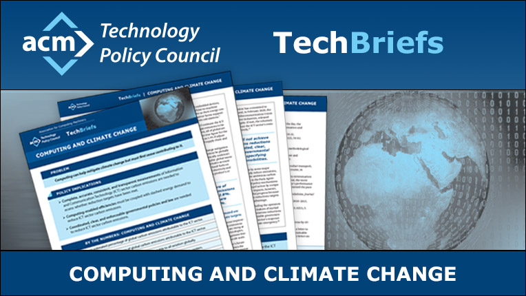 The first TechBrief concerns the deepening crisis of climate change, focusing on the issue that computing can help mitigate it but must first cease contributing to it. Policy implications suggested by the TPC include that all-encompassing measurements of Information and Communication Technology sector carbon emissions are needed to assess whether reduction targets have been met, computing-enabled efficiencies must be coupled with slashed energy demands, and that coordinated, clear, and enforceable governmental policies and law are needed to reduce ICT carbon emissions.